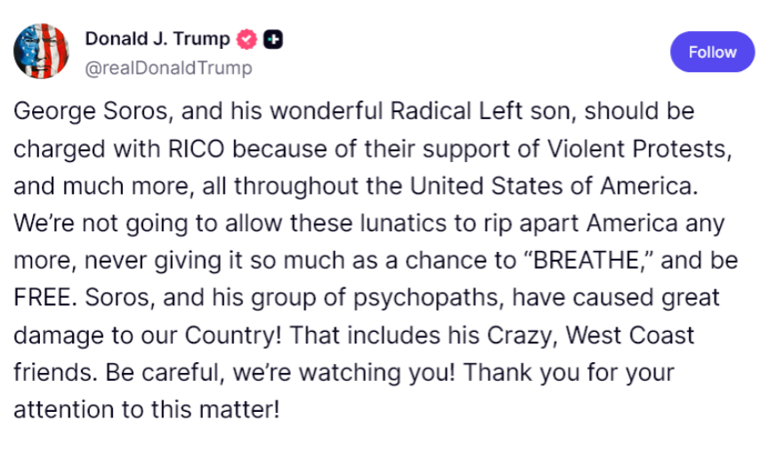 „George Soros și minunatul său fiu de stânga radicală ar trebui acuzați în baza legii RICO pentru sprijinul acordat protestelor violente și multe altele, pe întreg teritoriul Statelor Unite ale Americii. Nu vom mai permite acestor nebuni să distrugă America, fără a-i da nici măcar o șansă să „RESPIRE” și să fie LIBERĂ. Soros și grupul său de psihopați au cauzat daune enorme țării noastre! Asta include și prietenii lui nebuni de pe Coasta de Vest. Aveți grijă, vă urmărim! Vă mulțumim pentru atenția acordată acestei chestiuni!” a scris președintele Trump pe Truth Social.